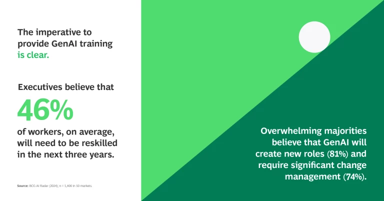Winners are upskilling systematically. To reap the rewards of AI, leading companies ensure that teams know how to use it most effectively—and scale up their reskilling muscle accordingly. Most leaders agree that GenAI will create new roles in their companies and expect that, on average, almost half of their workforce will need to be reskilled in GenAI over the next three years.