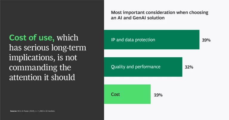 Winners are vigilant about cost of use. With GenAI’s rapidly broadening accessibility, companies can expect swift adoption—and rising related costs—as use of these tools spreads. Currently, however, too few executives are thinking this far ahead. Only 19% of those surveyed view cost as the top concern when choosing an AI/GenAI solution.