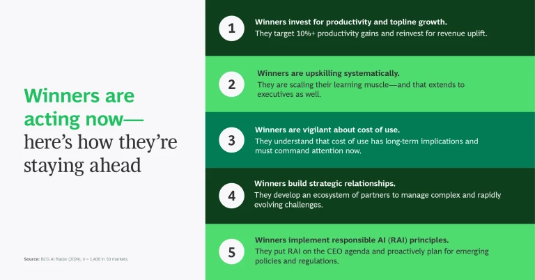 Winners implement responsible AI (RAI) principles. The sheer speed of GenAI adoption makes RAI more important than ever—especially as threats in areas such as cybersecurity emerge. Organizations must be proactive in addressing RAI issues, no matter where they are on their AI journey.