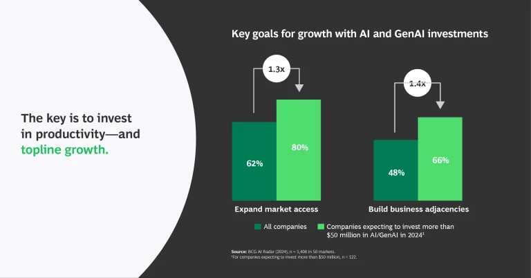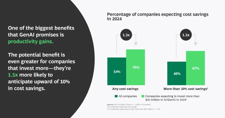 Winners invest in productivity and topline growth. Of the companies that expect to see cost savings from AI and GenAI in 2024, roughly half anticipate more than 10% in cost savings. In concrete terms, that would mean savings of $1 billion for a company with $10 billion in revenues.