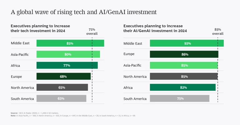 - 71% of the leaders we surveyed say that they plan to increase their company’s tech investments in 2024, up from 60% in 2023, and an even larger percentage (85%) say that they will increase their spending on AI and GenAI in 2024.