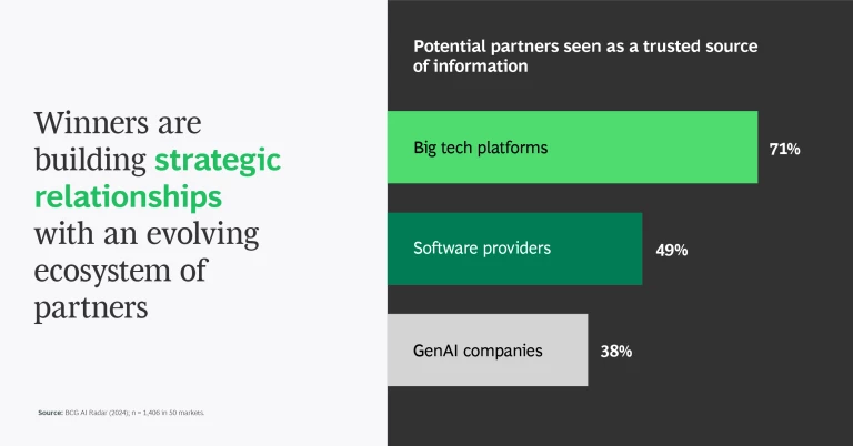 Winners build strategic relationships. AI leaders understand that the technology and the solutions it makes possible are moving fast. Only 3% of executives consider preexisting partnerships a priority when looking for AI solutions. The winners are actively building a partnership ecosystem with multiple companies, including software providers and GenAI startups, in order to gain access to cutting-edge technology and create near-term value.