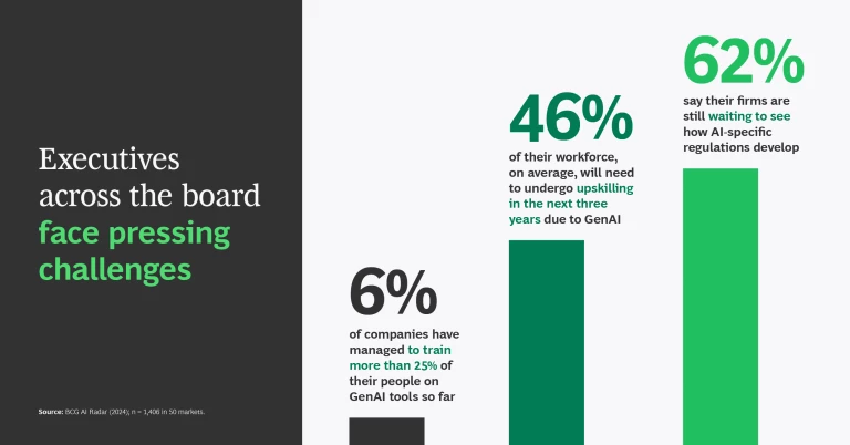 While almost all executives now rank AI and GenAI as a top-three tech priority for 2024, 66% of leaders are ambivalent or dissatisfied with their progress on AI and GenAI—and only 6% have begun upskilling in a meaningful way. How can executives set up their organizations to seize the business opportunities that GenAI offers?