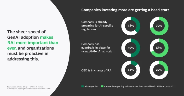 BCG research has shown that organizations whose CEOs participate in RAI initiatives realize 58% more business benefits than those whose CEOs are uninvolved. Of the companies in our survey that plan to invest more than $50 million in AI and GenAI in 2024, 27% put the CEO in charge of their RAI strategy (versus 14% overall).