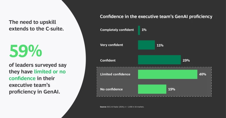 Most executives, in fact, report that only 1% to 10% of their workers are currently trained on GenAI tools. Executives need training, too, as 59% of leaders surveyed say that they have limited or no confidence in their executive team’s proficiency in GenAI.