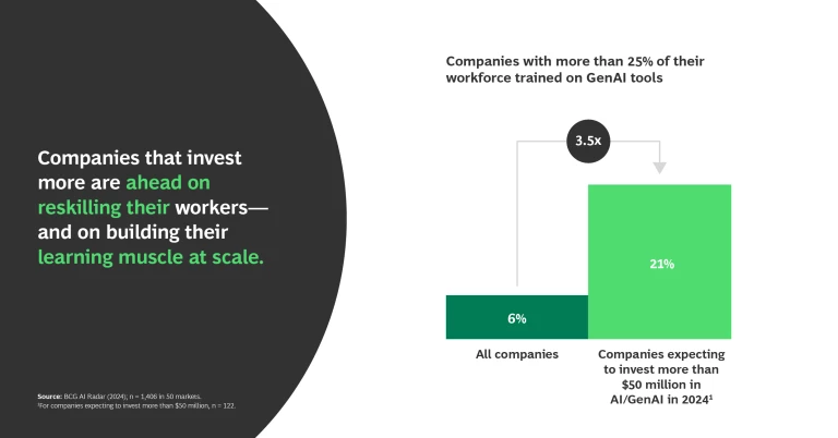 Winning companies already have a head start in adopting the necessary technologies. BCG's 2023 DAI study found that leading firms typically have three times as many full-time employees upskilled on AI as others do. Our survey yielded a similar finding: 21% of organizations spending upward of $50 million on AI and GenAI next year have already trained more than a quarter of their people on the relevant tools (versus just 6% of companies overall).