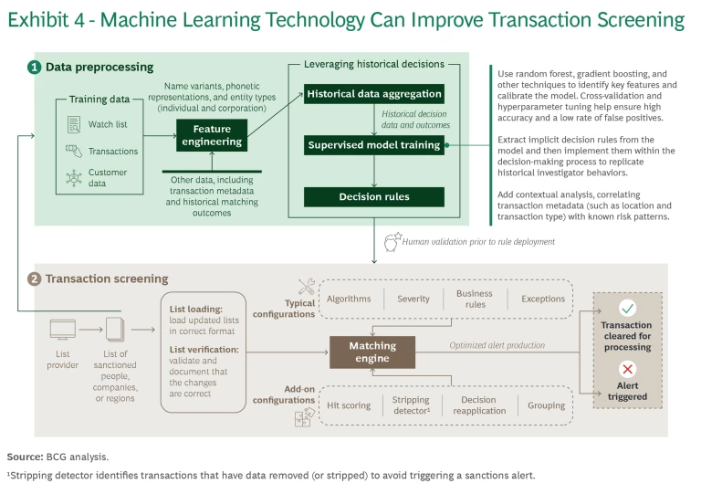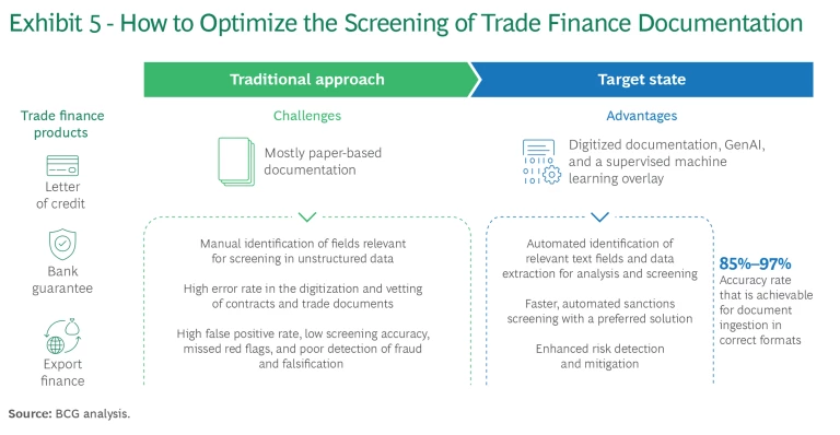 Machine learning can be a powerful tool for strengthening matching quality, such as by correlating metadata (for example, location or transaction type) with known risk patterns, an approach that some vendors are already exploring. If there is sufficient high-quality data, machine learning systems can start by basing their models on decisions previously made by human investigators and refining continuously after that. This approach requires high confidence in the quality of previous investigations and decisions, and the rules need human validation before deployment. However, using machine learning technology is a powerful way to reduce false positives and improve screening accuracy. It allows for a differentiated approach that avoids all false positives falling into the same investigation queues, overpowering operational teams. In trade finance, combining GenAI with a supervised machine learning tool can aid documentary challenges in due diligence by extracting data in the right formats for screening and further compliance processing. (See Exhibit 5.)