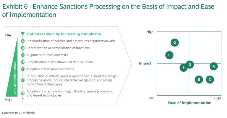 The applications above underline the power of AI to drive efficiency in sanctions compliance. Nevertheless, it is essential not to be swayed by hype; these are not buy-and-forget solutions. BCG’s time-tested 10-20-70 principle underlines that the most significant challenge in deploying GenAI and automation to improve sanctions compliance will be transforming people and processes, rather than just investing in the technology. However, the gains from a successful program are substantial when used in mindful combination with additional solutions. BCG’s research and analysis show that significant efficiency gains can be achieved without compromising compliance or regulatory standards.