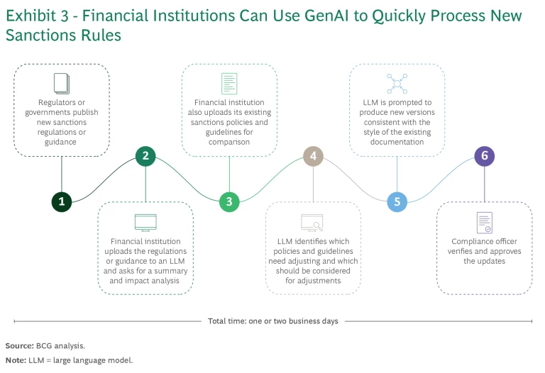 To see the power of GenAI, consider one of the simplest examples already used by innovative FIs. They use off-the-shelf large language models (LLMs) to reduce the workload of sanctions compliance teams when internal policies need to be quickly updated after the issuance of new regulatory guidance or rules. (See Exhibit 3.)