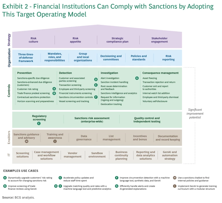 To help FIs address these challenges, BCG developed a comprehensive sanctions compliance target operating model that incorporates the critical components and controls expected by regulators. (See Exhibit 2.)