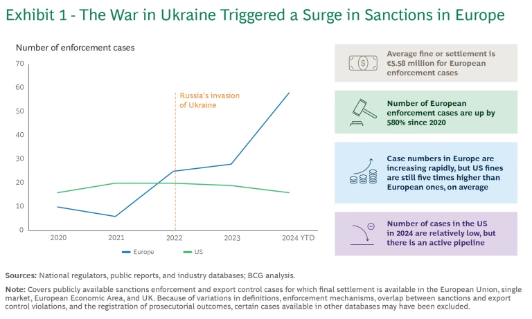 - The EU is stepping up its game in enforcement. BCG has tracked the fines, penalties, and settlements from European sanctions from 2020 through October 2024. About €490 million has been paid for violating European sanctions since 2020. The real impact for the offending companies may be five to eight times higher because of the cost of look-back exercises, additional compliance hiring, remediation, sanctions training, audits, and tech investment, plus the cost of a reduced risk appetite and changes to their strategy. While €490 million is a modest amount compared with the penalties paid in the US, it is notable that case numbers in Europe have increased by 580% since 2020, with 85% of them being prosecuted and settled after 2022 and 65% being directly attributable to violations of the sanctions imposed on Russia and Belarus after 2022. (See Exhibit 1.)