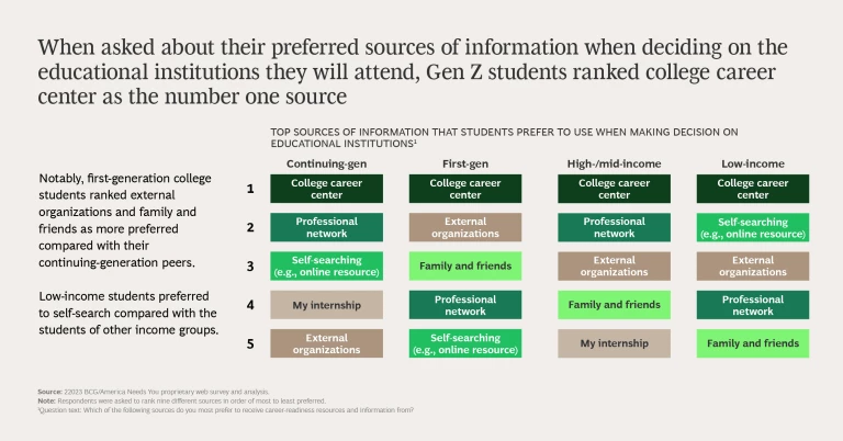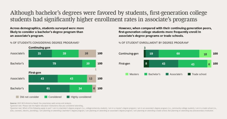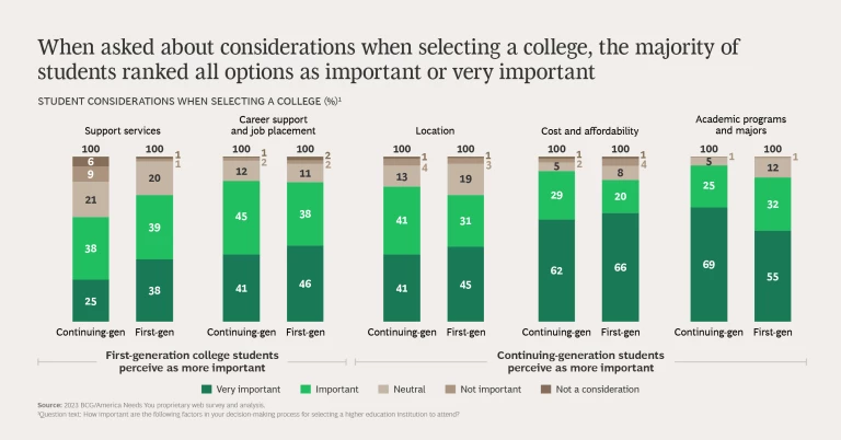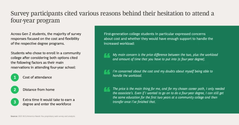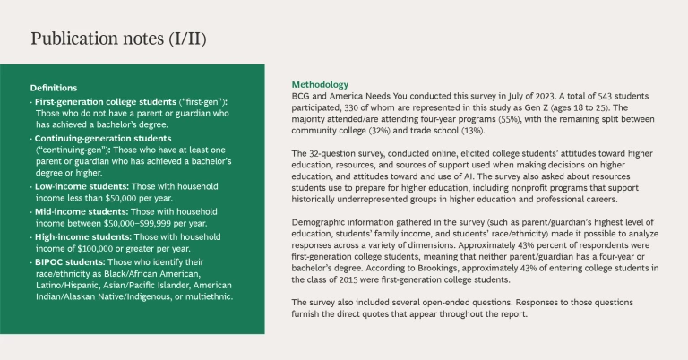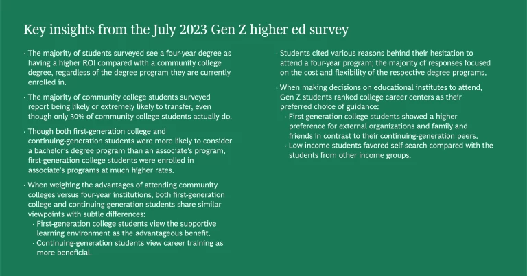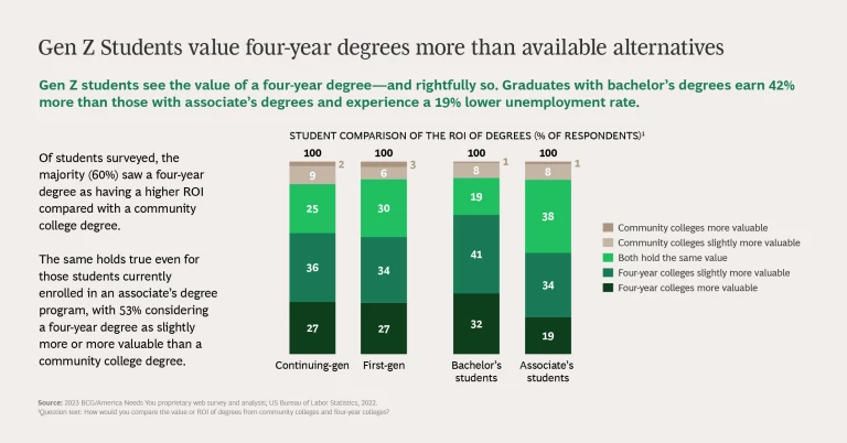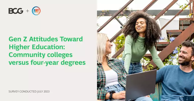 The impact of AI on the future of work has been the focus of countless conversations, classes, and articles over the past year. But understanding its impact on the future of higher education for Gen Z and beyond is also important. According to a recent BCG survey of about 300 Gen Z college students, higher education needs to incorporate AI in two critical ways: as a tool to support and instruct students, particularly low-income and first-generation college students during their college careers and as part of the curriculum so students are more attractive to employers and prepared to use AI in their work lives. (See the slideshow.)