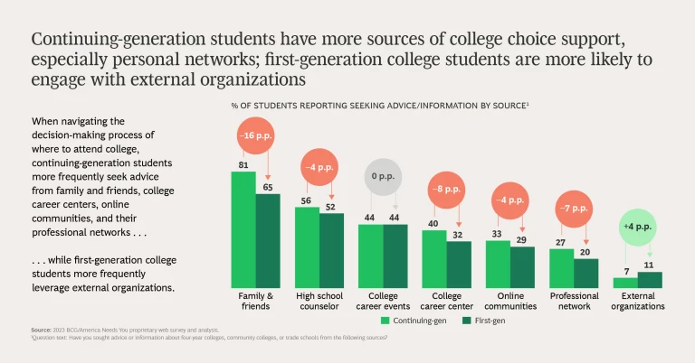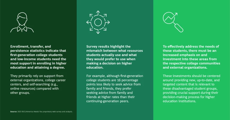- Invest in more AI tools. These can improve student outcomes and the college’s bottom line by increasing persistence and graduation rates at a relatively low cost to the institution. For example, AI chatbots are already proving effective at providing students information and thus improving their confidence to continue with their studies. These chatbots are especially powerful for first-generation college students whose network of family and friends usually aren’t a good resource for this information. Also, AI-backed search engines can help students with self-directed searches, which many low-income students prefer, even more so than students from other income groups.