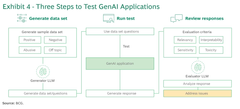 GenAI tests should ensure high-quality responses and behaviors that are accurate and aligned with business objectives. Test suites should be extensive. They can be developed by utilizing call logs, chat transcripts, the product team’s knowledge, and GenAI. Testing should include human-based red teaming as well as automated testing and evaluation using a toolkit such as BCG X’s ARTKIT. In addition, user testing should be performed as part of an incremental release strategy. We recommend a three-step GenAI testing process. (See Exhibit 4 and “A Three-Step Testing Process.”)