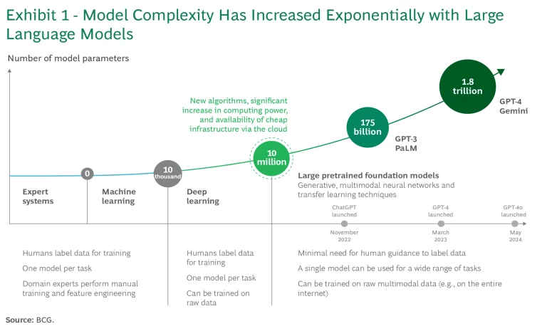 AI models have evolved from a handful of parameters with machine learning, to tens of thousands with deep learning, and now to millions, billions, and trillions with the large language models (LLMs) that are the foundation of GenAI. (See Exhibit 1.) GenAI systems are stochastic and dynamic and therefore nondeterministic, potentially producing different responses to the same questions over time. These systems can converse in natural language with many users simultaneously, creating vastly more scenarios for misuse—including errors, misinformation, offensive or stereotype-reinforcing language, and intellectual property (IP) concerns.