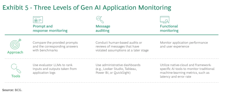 Operate and Monitor. Sustained performance monitoring is crucial for GenAI, owing to the drift that LLMs may experience over time and the sudden performance changes that can occur when there are foundational model updates. Consistent and analyzable monitoring enables rapid analysis of an agent’s behavior in real life. Utilize the feedback to fine-tune guardrails, workflows, and other implementation strategies and ensure that the responses meet desired standards. We recommend three levels of Gen AI application monitoring. (See Exhibit 5 and “Monitoring Across Three Levels.”)