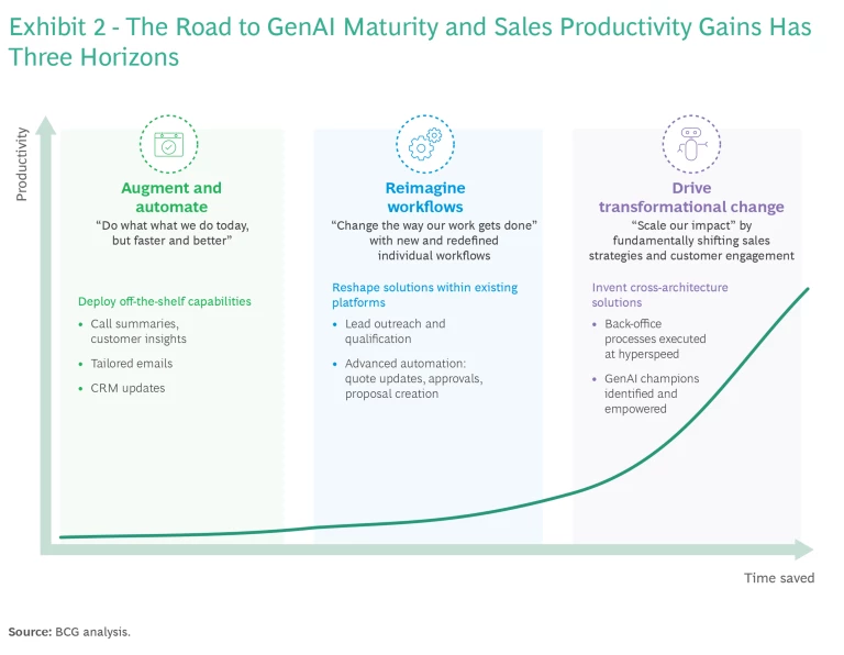To help organizations get on the right track, BCG has developed an approach to transforming their go-to-market (GTM) function by harnessing GenAI at scale and on pace. Structured along three horizons, our framework serves as a guide for enterprise-wide use of GenAI to augment the reach of sales teams, automate tasks intelligently, reimagine processes and workflows, and transform GTM functions. This approach enables organizations, from the outset, to build the seller trust that is a prerequisite for reaping immediate seller productivity benefits when leveraging new capabilities within existing sales technologies and processes. At the same time, it helps teams develop the skills needed to work with GenAI personas (digital team members that imitate human behavior) as key enablers of their GTM sales strategies.