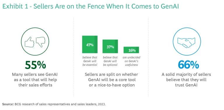 - Sellers need to reskill in order to partner with AI effectively. BCG research shows that sales leaders view seller competencies as a core challenge of leveraging GenAI, and over half (51%) of sellers believe that reskilling is necessary to partner effectively with GenAI. Teams require training on how to best work with AI as the technology’s role within their workflows expands.