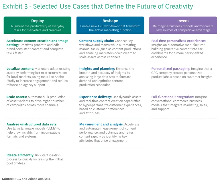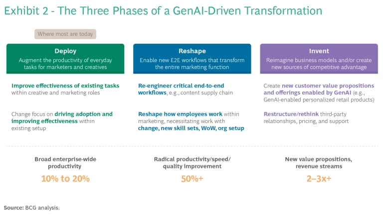 BCG’s Deploy-Reshape-Invent framework describes the ways that creative and marketing organizations are using GenAI to transform themselves. (See Exhibit 2.) A recent survey of CMOs showed that over 84% of marketing organizations have deployed GenAI tools, a remarkable pace of rollout given the short time these tools have been on the market.