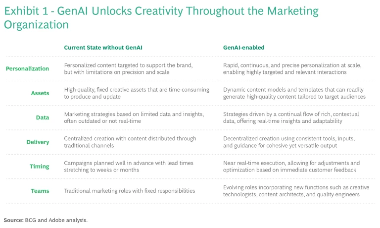 Longstanding practices in the creation of marketing content constrain creativity and limit the speed and scale of what an organization can deliver and the goals it can pursue. Marketing organizations cannot capitalize on the opportunities GenAI unlocks until they also unblock the ways that data, work, and ideas flow through the organization. At the same time, leaders must begin planning for deploying GenAI in a way that is commercially safe, responsible, ethical, and easy to adopt across teams.