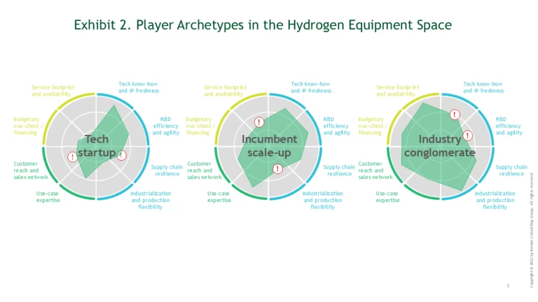We see three types of players currently at work in the hydrogen equipment industry, regardless of geography, each one with their own strengths and weaknesses (see Exhibit 2).