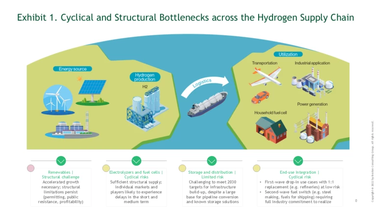 This situation is largely the result of the low-carbon hydrogen industry’s immaturity and the need to scale up rapidly. Unlike the wind and solar panel industries, which have had decades to mature, demand for electrolyzers and fuel cells has begun to increase many-fold in just the past five-to-ten years. This is creating bottlenecks and delays that cascade throughout the supplier landscape. Some are cyclical— they can likely be relieved in the short-to-medium term. Others are structural and will require fundamental change to resolve.