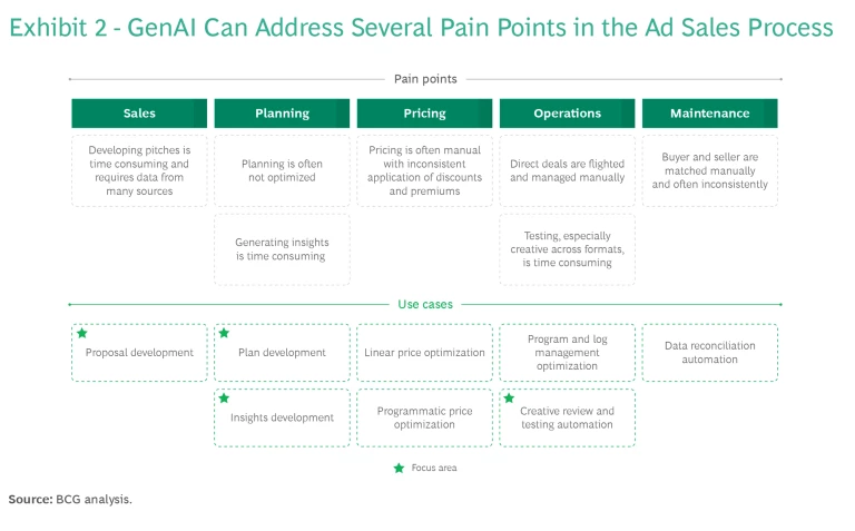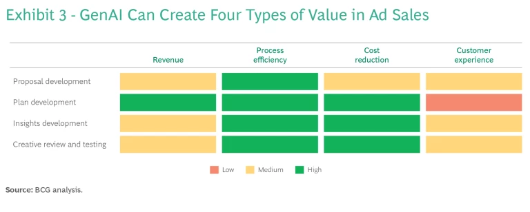 Get started. For many ad sales executives, generative AI can understandably seem daunting in face of other challenges. But inaction is not an option. Start with high-value short-term uses cases that can quickly demonstrate value before moving on to more ambitious cases. The opportunity to lower costs, improve efficiency, and provide customers a higher level of service should be cause for action and even optimism.