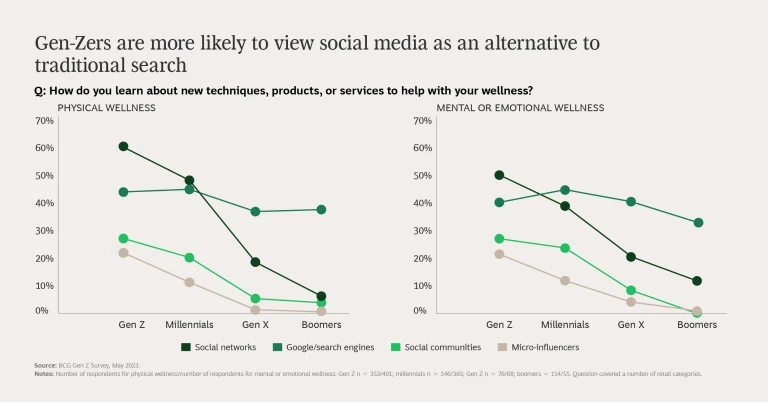 More Focused on Nontraditional Social Media. Gen-Zers rely less heavily than other generations on Google and other traditional search engines when choosing a product. Instead, they augment their traditional search findings with information from social communities such as Reddit and other message boards and traditional social media such as TikTok and YouTube. For instance, they use TikTok to discover what a new makeup looks like on others before buying it, or they watch their peers trying out the latest footwear on YouTube. In fact, Gen-Zers are very engaged with a variety of social media and use it in many different ways—including search, social shopping (using social media to browse, research, and buy products from digital storefronts), and staying up-to-date with trends.