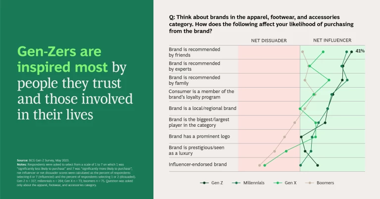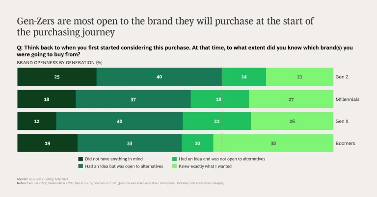 Most Influenceable. Gen Z is the most influenceable generation across age groups, as its members are the most open-minded about the brand they will ultimately buy when they begin their purchasing journey. In addition, they are far less interested than prior generations in purchasing items with a prominent brand logo or choosing a brand that is seen as “luxury.” Instead, they are most likely to base their choices on the opinions of the people they trust, such as friends and family—although experts also have a say. At the same time, they are less open to switching the outlets they buy from, being more retailer-loyal than brand-loyal.