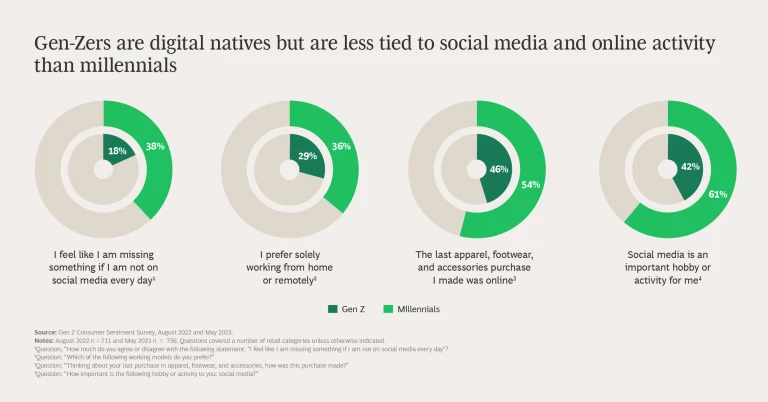 Less Social-Media Oriented. Despite their use of social media in buying decisions, Gen-Zers are less attached to social media in general than the previous generation of millennials. For example, only 18% say that they feel like they are missing something if they are not on social media every day, compared with 38% of millennials. Just 42% say that social media is an important activity or hobby for them, versus 61% of millennials. And we find that Gen-Zers prefer to shop in-store to understand the look and feel of the items they want, while millennials prefer to purchase online. This trend is consistent across categories, including grocery.