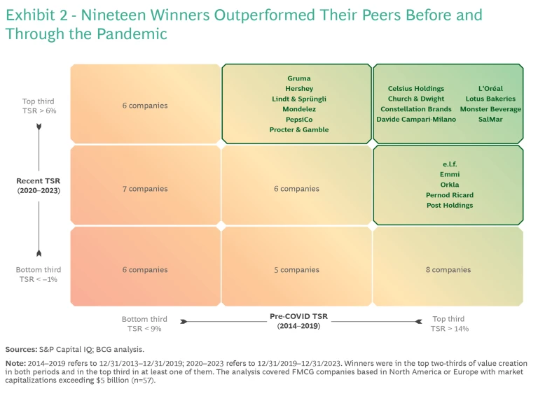 Despite these headwinds, there is still reason for optimism. A set of 19 leading FMCG companies have overcome the challenges of the last decade and delivered strong shareholder returns both leading up to and through the pandemic. The list of winners includes well-established giants such as L’Oréal, Procter & Gamble, and PepsiCo and smaller fast-growing brands such as Celsius and e.l.f. Collectively, they generated a median annual TSR of 7% from the end of 2019 through the end of 2023, compared with 0% for the rest of the industry. (See Exhibit 2.)