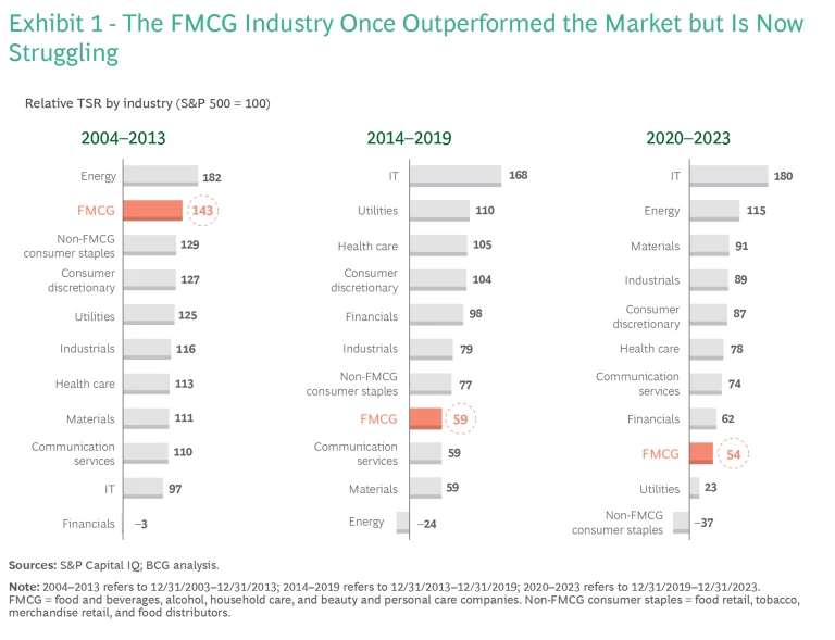 At the start of the millennium, the FMCG industry was consistently outperforming other industries in total shareholder return (TSR). The industry enjoyed steady top-line growth in mature and emerging markets and healthy returns buoyed by strong brands and scaled go-to-market systems.