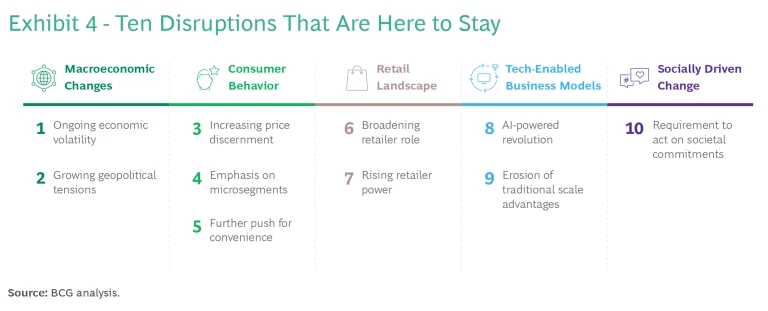 By understanding the strategies of these winners and adapting to a more challenging era, other companies can improve value creation—and prepare for the economic, consumer, retail, technological, and societal disruptions that will continue to affect the industry. Some of these disruptions will escalate in intensity. (See Exhibit 4.)