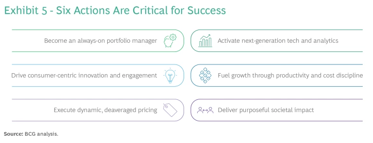 By looking back at how their successful competitors achieved enduring TSR—and looking forward at ten ongoing disruptions—FMCG companies can chart their own paths to a prosperous future. We have identified six interlocking, self-reinforcing, and essential actions that collectively make up a winning value-creation agenda for FMCG companies. (See Exhibit 5.)