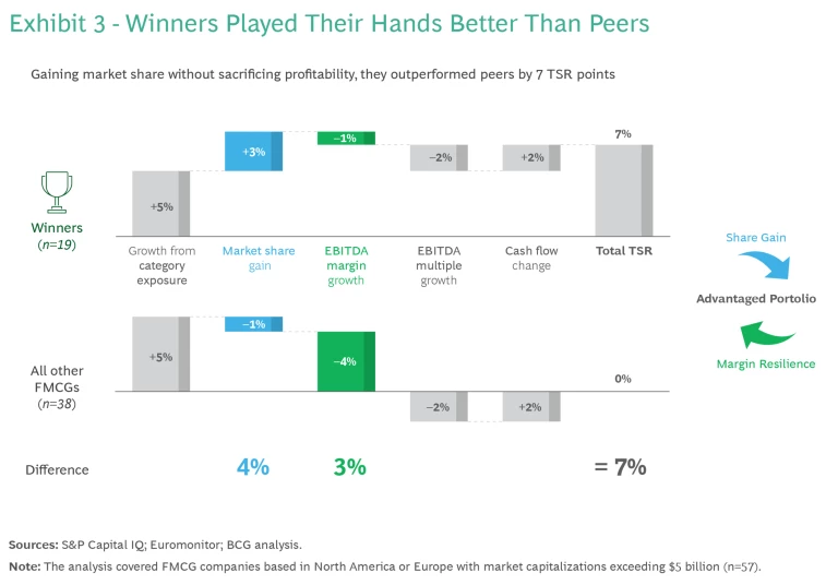 These companies did not rely simply on being in the right category at the right time. Rather, they gained market share without sacrificing their margins. They invested in balanced growth, raised prices smartly, and protected their bottom line. (See Exhibit 3.)