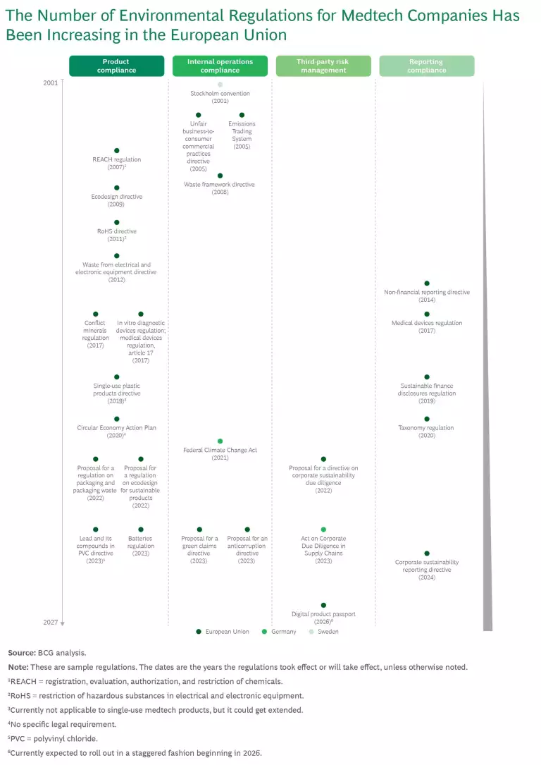 Over the past 20 years, the number of ESG-related regulations relevant to medtech companies has risen dramatically. (See the exhibit.) This increase is on top of a proliferation of product regulatory requirements to safeguard patient health—for example, by protecting them from the risk of infection—and to ensure that the products benefit patients.