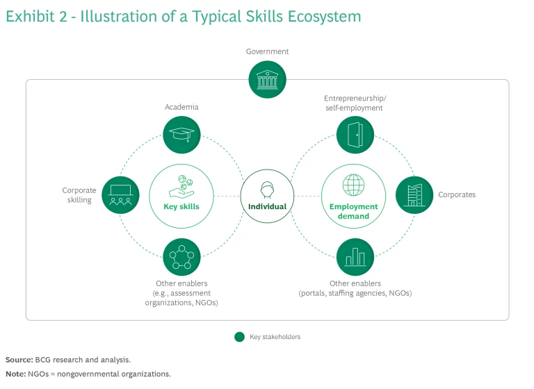 On the demand side of the skills ecosystem are participants like industry and companies, as well as key enablers like staffing agencies and job portals. On the supply side, key stakeholders include training providers (corporates and academia) that enable skill development in collaboration with other supporting organizations, such as assessment agencies that evaluate and certify candidate proficiency. Governments typically play the role of facilitator, guiding these ecosystems to ensure alignment and success. For example, governments may provide funding and resources to individual training programs, making it easier for people to access skill-building courses. (See Exhibit 2.)