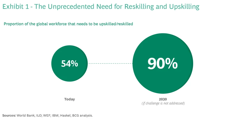 Governments around the world are grappling with a significant skills gap in their national workforces. Fifty percent of today’s global working population needs to upskill or reskill to stay competitive; by 2030, the World Economic Forum projects this will grow to 90%. (See Exhibit 1.) Failure to address this issue could result in a staggering global GDP loss of up to US$15 trillion by 2030.
