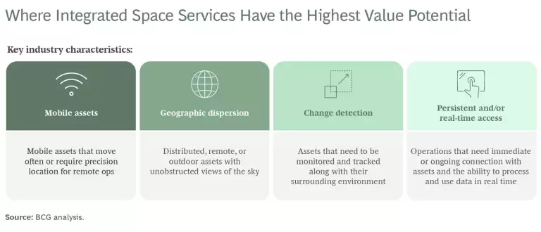 Individually, these services can enable important new products and ways of working. But in combination they are even more potent. Companies with mobile assets, or operations in remote areas, as well as those that can create value from real-time data and tracking, could realize as much as a 25% increase in revenue and a 10% decrease in operating costs within one year of adopting integrated space services, BCG estimates.