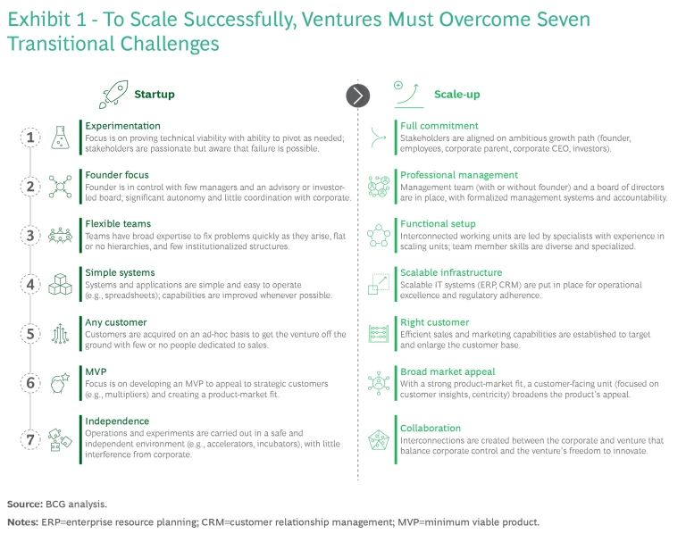 Corporates that collaborate with ventures can scale them in several different ways: create a partnership, become a minority or majority investor, incubate the venture internally, or create/acquire a venture and allow it to operate outside the corporate parent as an agile startup. No matter how they choose to collaborate, however, they’ll face seven challenges when transitioning from a startup to a scale-up (see Exhibit 1).