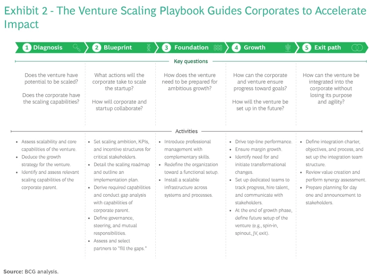 But if they don’t demonstrate measurable impact quickly, these corporate venturing activities can lose management support. Companies therefore need the right structures in place to help promising startups scale up fast to establish a market presence, become profitable, and contribute to the corporate parent’s financial and strategic targets. This is not easy, and few companies do it well. That is why BCG has developed a scaling playbook for venturing activities, which is based on our experience from more than 200 corporate venturing cases.