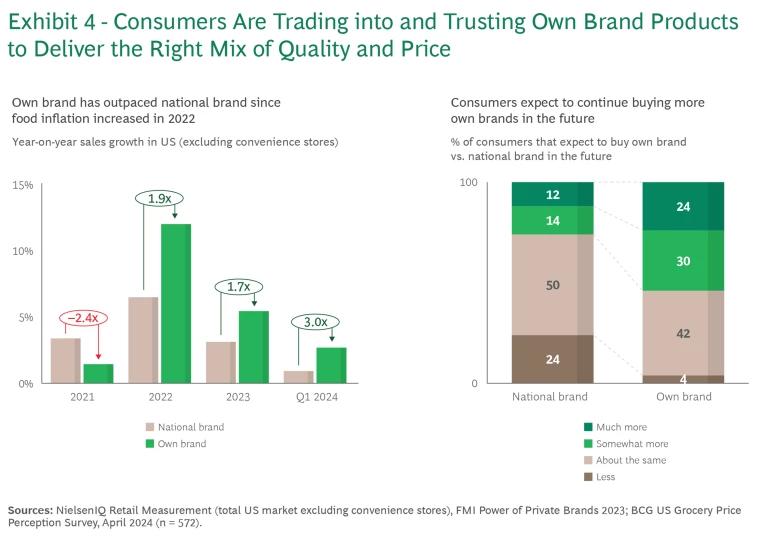 In the face of rising prices, consumers are embracing private label products as a cost-effective alternative to national brands—54% of surveyed consumers indicated they will increase their purchase of private label products in the future. (See Exhibit 4.) This appeal of private labels spans across all categories but has seen particular growth in grocery, where many consumers view them as equivalent in quality to their branded counterparts. Retailers looking to capture value-driven shoppers should seize this opportunity to expand their private label offerings.