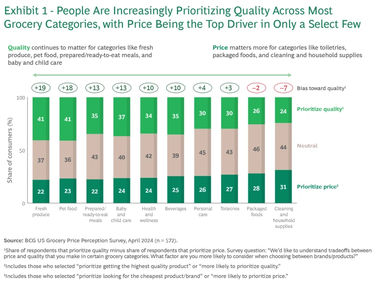 - Even within the grocery category, there are nuances: shoppers are willing to pay more for quality in areas like meat and fresh produce, but are more likely to cut costs on pantry staples and cleaning products.