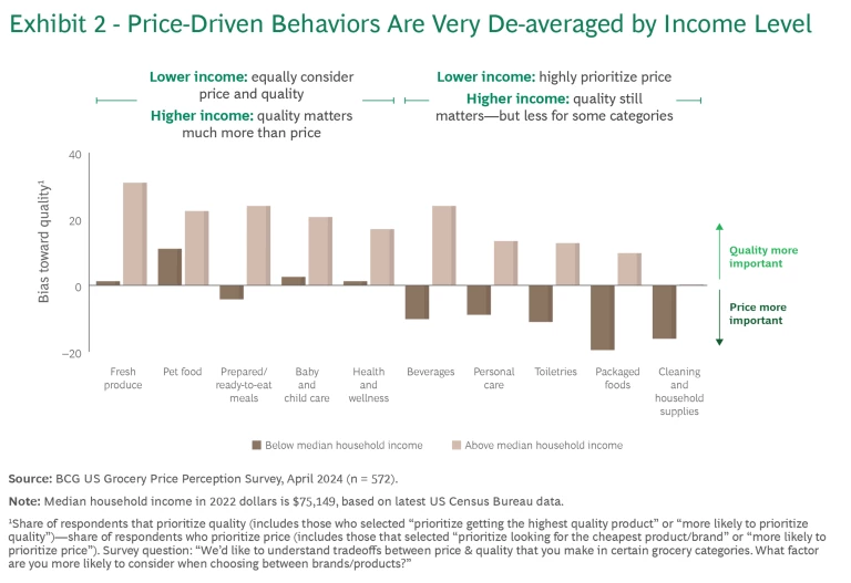 While grocery spending remains stable, not all categories are equally insulated. Price is a key driver of retailer choice for toiletries, packaged foods, and household and cleaning supplies, with a notable percentage—between 27% and 31%—of consumers willing to substitute quality for savings. (See Exhibit 1.) Meanwhile consumers of fresh produce, pet food, and baby care products are more driven by quality despite rising prices of these essentials. This nuance in price vs. perceived quality decisions also hinges on the purchaser’s income group—for example, while 35% of consumers prioritize quality in beverages, lower-income purchasers still anchor on price when choosing a beverage product. (See Exhibit 1 and Exhibit 2.)