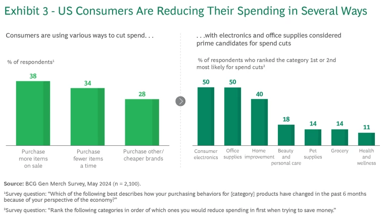 Shoppers are employing various strategies to manage their expenses, from buying fewer items to timing their purchases with promotions. The sharpest contrast is evident in the categories where consumers are most willing to cut back—electronics and office supplies top the list, while essentials such as groceries, pet supplies, and health products have largely escaped the chopping block. (See Exhibit 3).