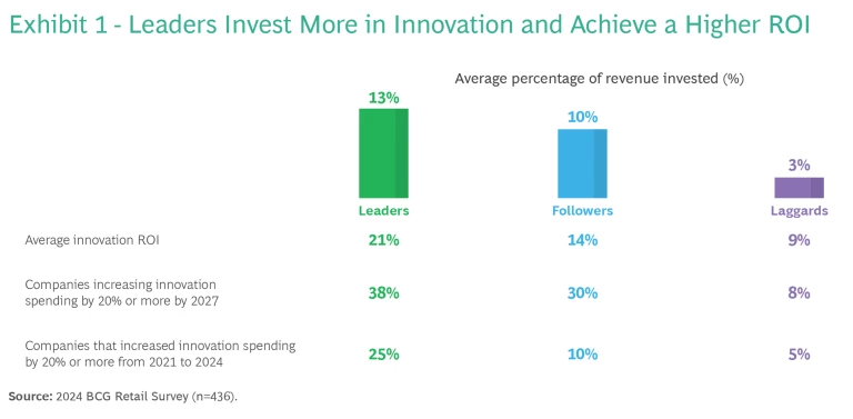 Our survey of more than 400 executives from a cross-section of retail sectors worldwide found that innovation leaders invest significantly more in innovation and achieve a higher ROI. (See Exhibit 1.)