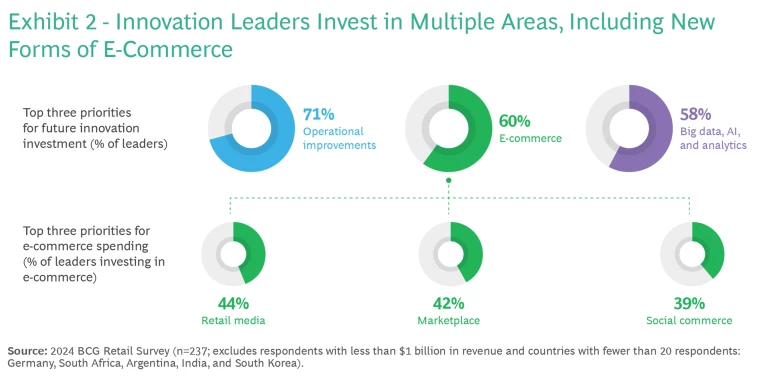 Leaders prioritize innovation investments in three areas: operational improvements; big data, AI, and analytics, and e-commerce. (See Exhibit 2.)