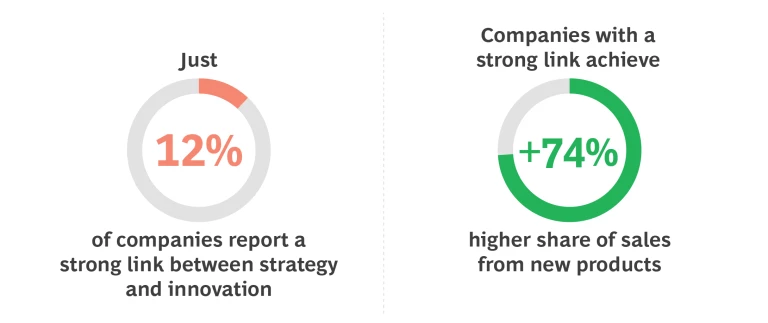 A strong link to business strategy focuses innovation investment—and it also delivers better innovation output. Strategy-led innovators achieve a share of revenue from new products 74% higher than companies with just a weak link between strategy and innovation. It’s time for innovators to recommit to strategy. Download the report or read the chapter for more.
