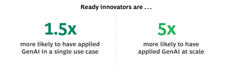 While 86% percent of innovators in our research are experimenting with GenAI to at least some degree, ready innovators are moving out ahead. They’re applying GenAI more frequently in a single use case and are five times more likely to have applied it at scale.
