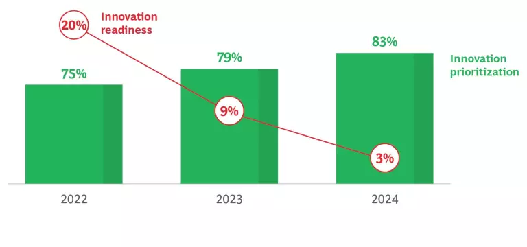 On readiness, 2024’s top-quartile innovator underperforms 2022’s median innovator. It’s a call for urgent action. Download the report or read the chapter for more.